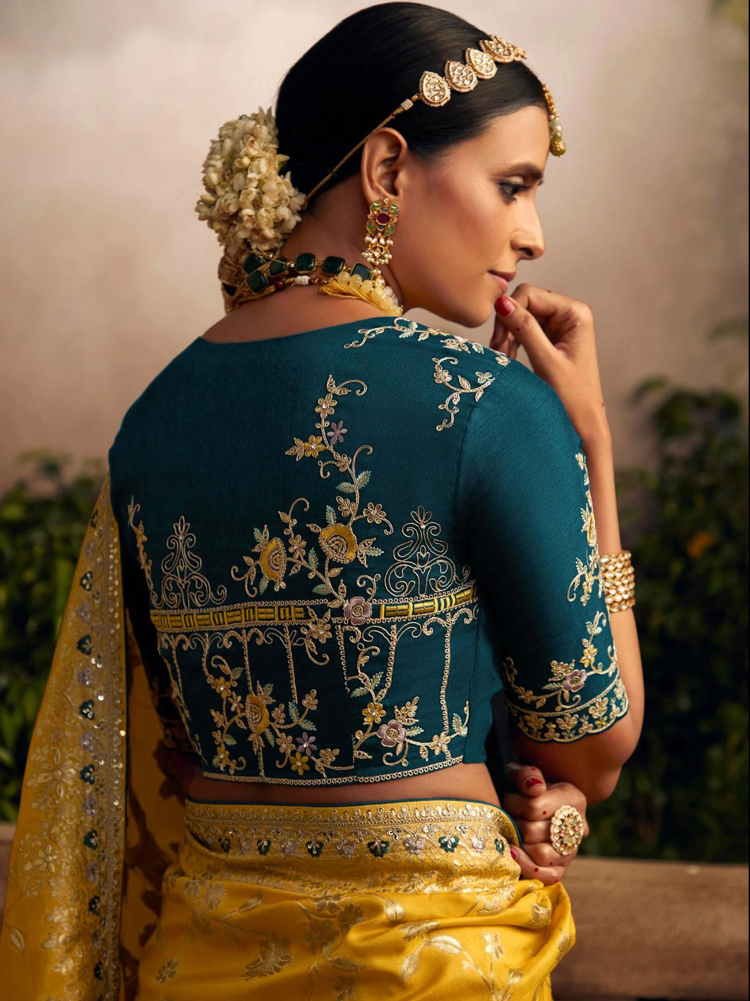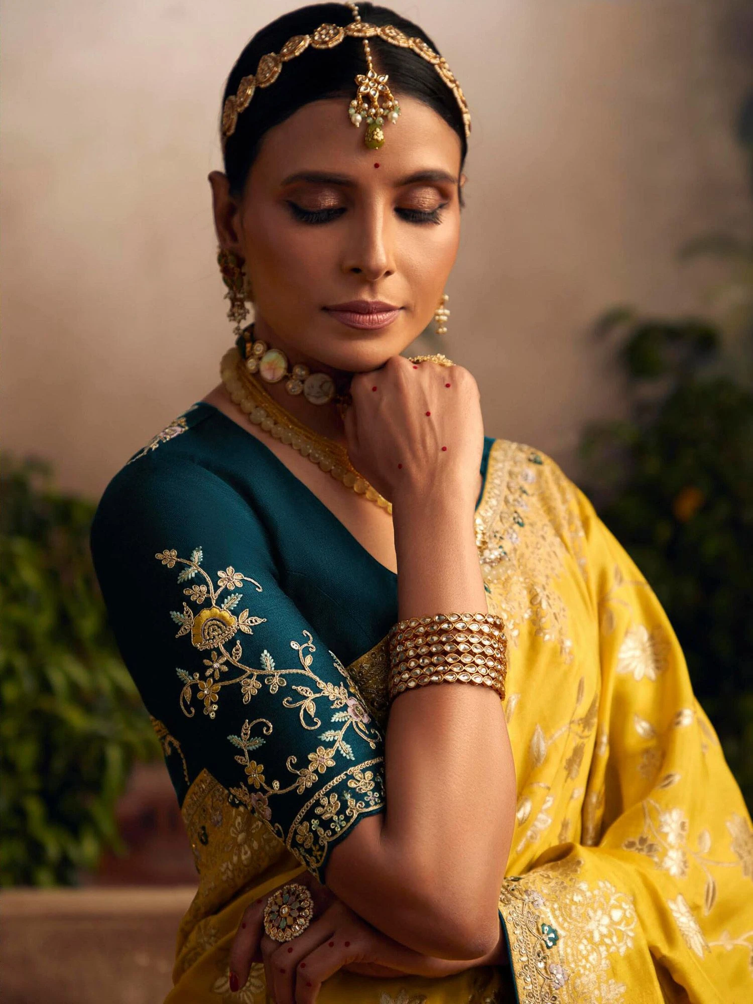 Evoke the diva in you wearing this amber yellow color saree crafted in dola silk. Enhanced using woven patterns, showcasing distinstive borders and pallu. Comes with a matching blue color embroidered blouse in dola silk. Note: The accessories featured are purely for fashion purposes. Due to photography reasons, some color variations may occur. The un-stitched embroidered blouse may be customized up to 42 inches.