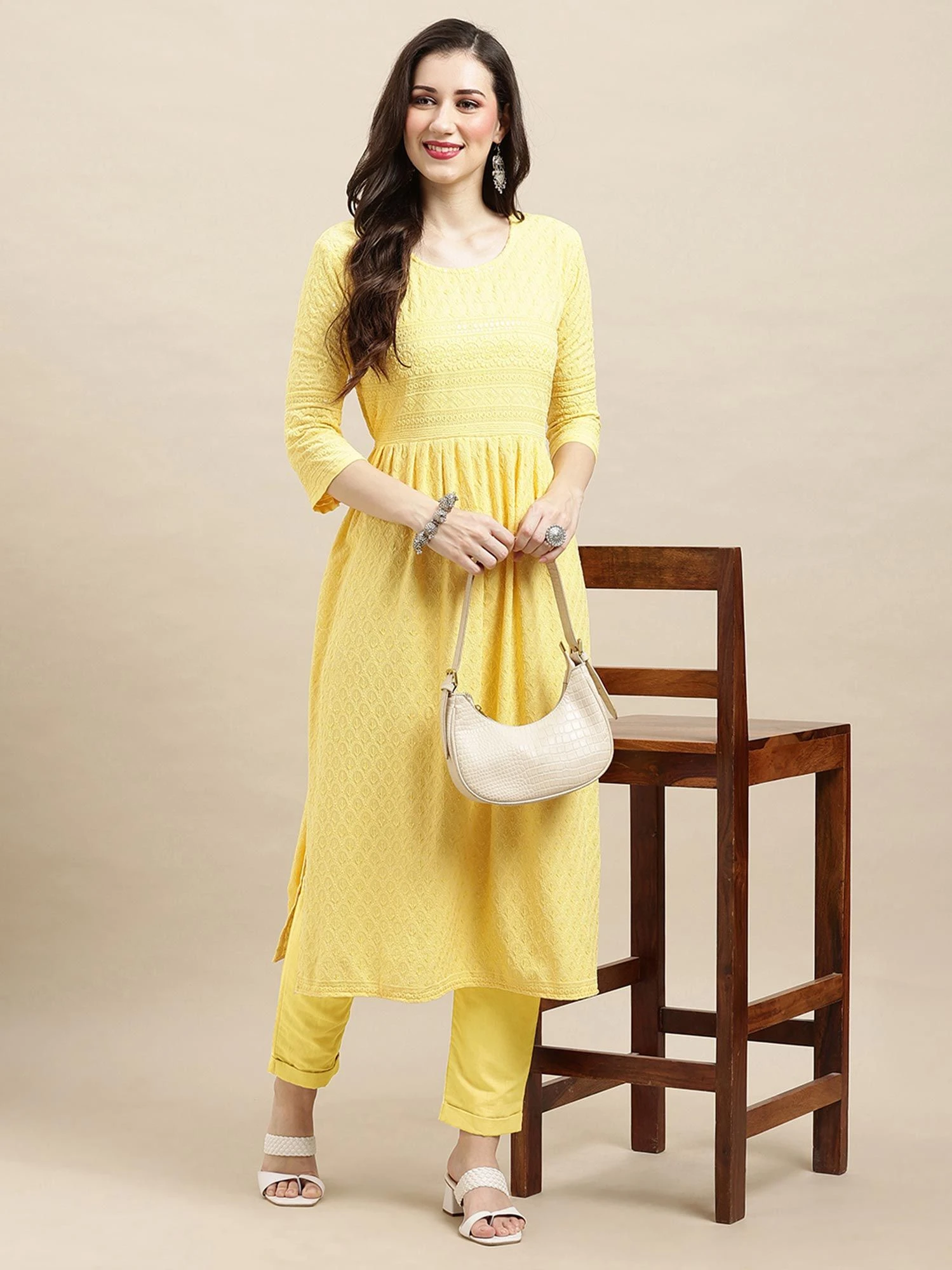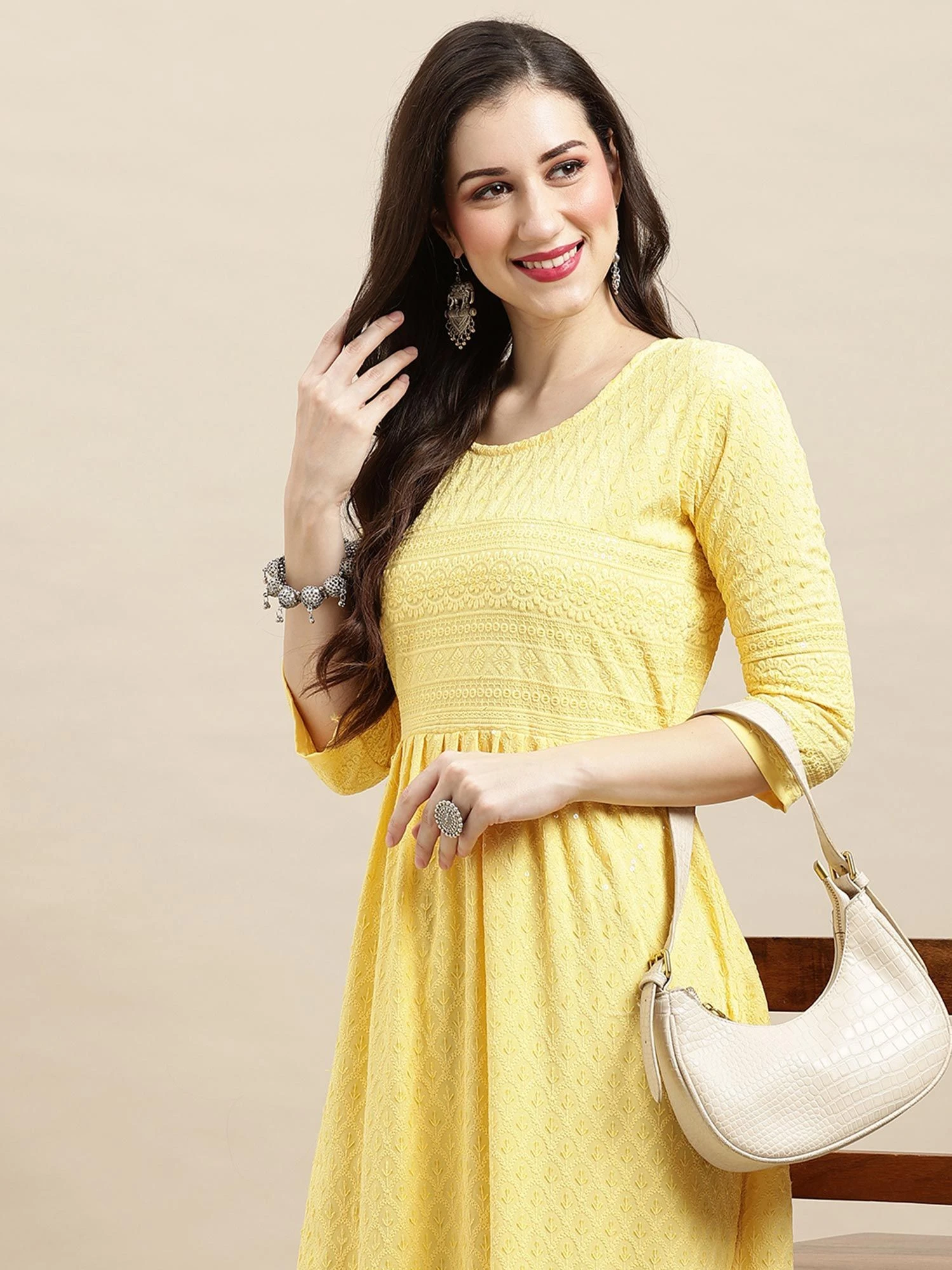 Brighten up your day adorning this bright yellow color quarter sleeved kurta made in rayon. Decorated with sequins and resham embroidered details all over. Note: Some color variations may occur owing to photography causes. Up to 1 inch of measurement fluctuation is possible.