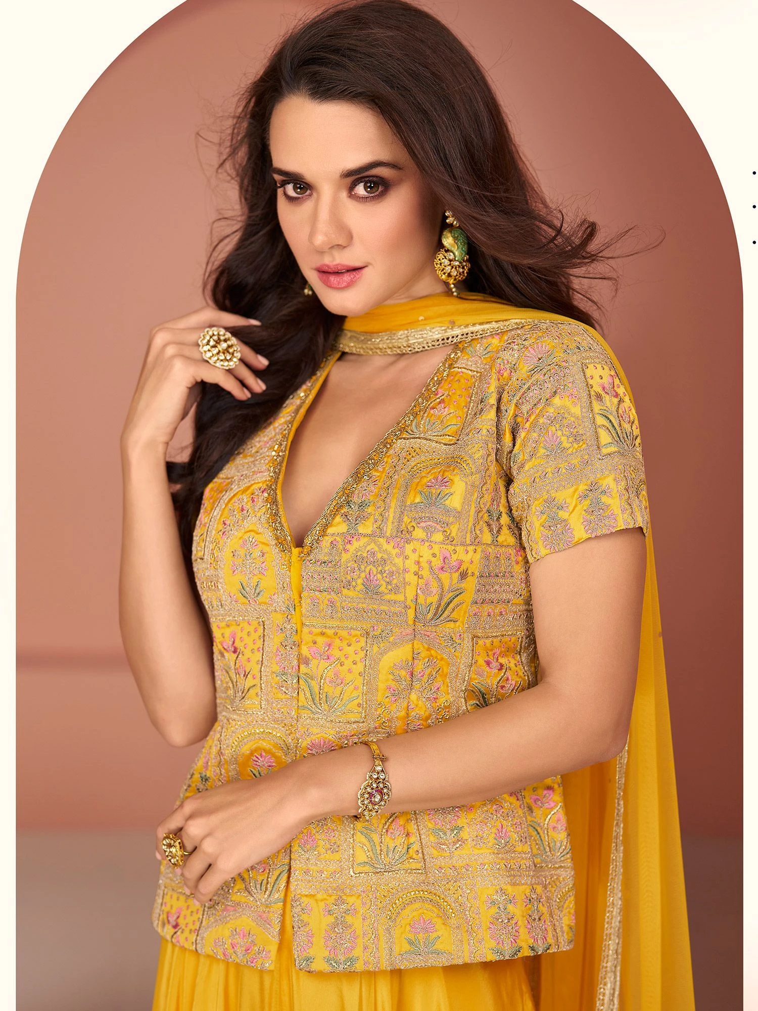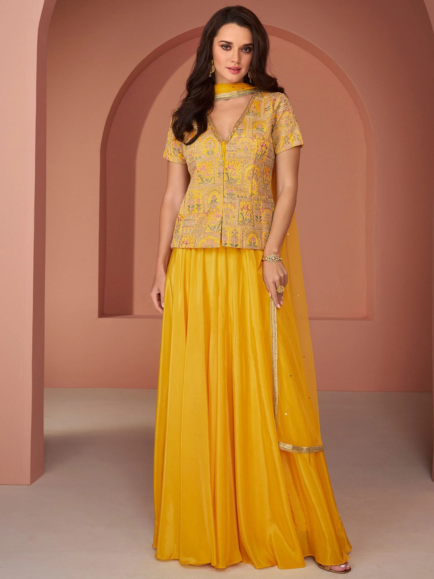 Adorning yourself in the poetry wearing this golden yellow color lehenga in georgette. Elevated with thread and zari embroidered work. Comes with a matching yellow color full length embroidered choli in georgette and yellow color dupatta, made in net. Note: The accessories featured are purely for fashion purposes. Due to photography reasons, some color variations may occur. The semi-stitched choli and lehenga waist may be customized up to 42 inches.