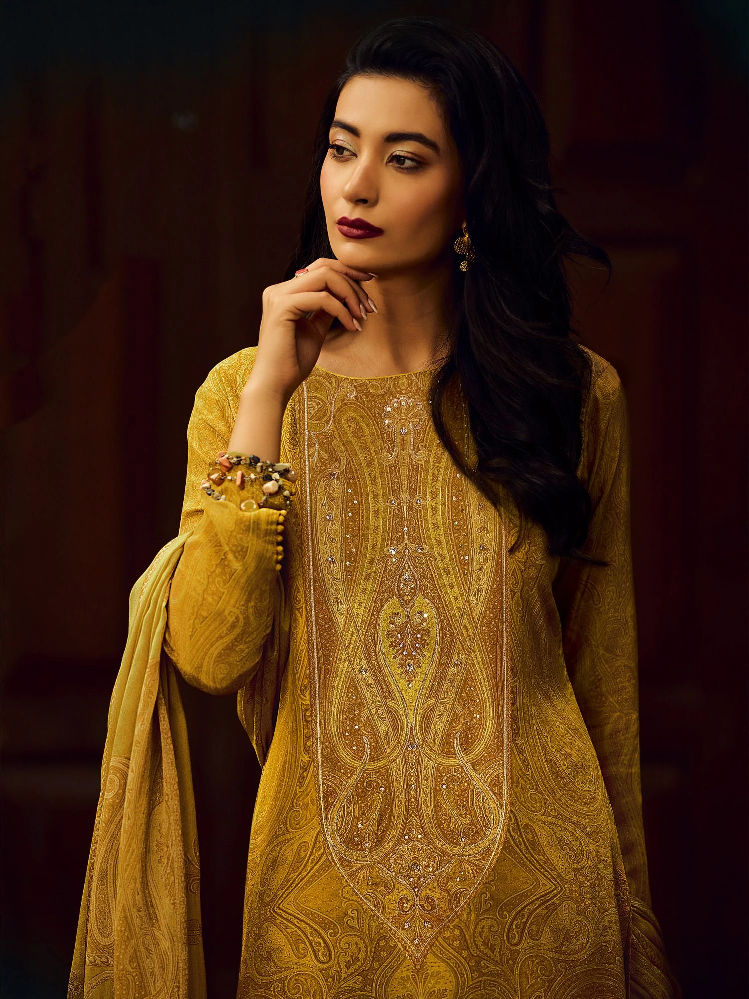 Seamlessly combines traditional charm and elegance with this amber yellow color straight cut kameez in pashmina silk. Designed using digitally printed embroidery all over. Paired with a pashmina silk dupatta and a churidar bottom, both made in yellow color. Note: Accessories shown are for styling purpose only. Slight color variation may occur due to photographic reasons. The semi-stitched kameez can be customised upto 42 inches.