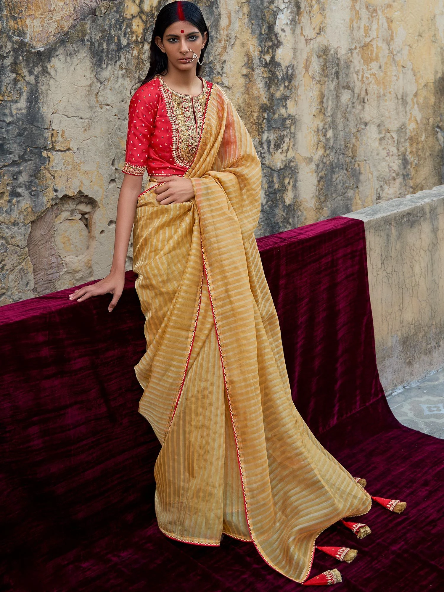 Spread the dazzling sparkles wearing this mustard yellow color saree crafted in organza. Furnished using printed patterns with enhanced borders using lace. Comes with a contrast matching bright red color silk blouse designed with embroidery. Note: The accessories featured are purely for fashion purposes. Due to photography reasons, some color variations may occur. The un-stitched blouse may be customized up to 42 inches.