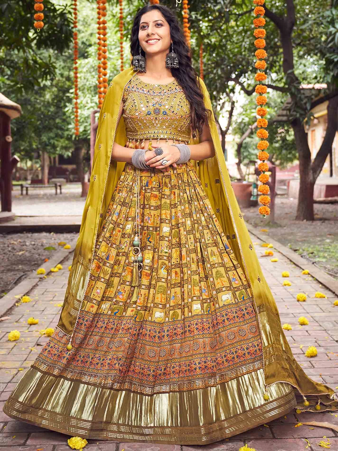 Spread your charm everywhere with this dusty yellow color printed lehenga in art silk. Paired with an art silk choli furnished with mirror work and thread embroidery and an art silk dupatta in yellow. Note: The accessories featured are purely for fashion purposes. Due to photography reasons, some color variations may occur. The semi-stitched choli and lehenga waist may be customized up to 42 inches.
