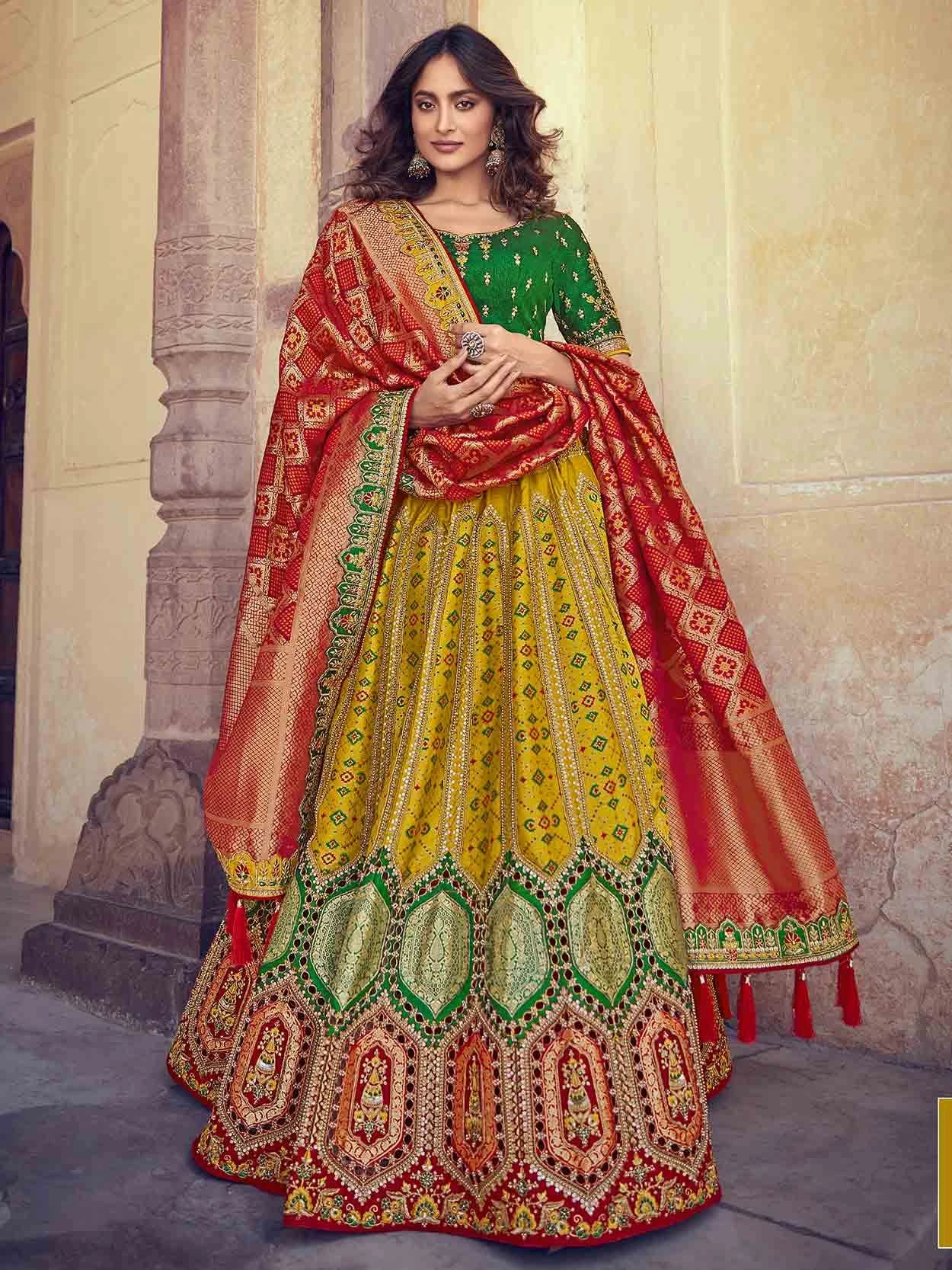 Yellow,Red Colour Banglori Silk Fabric Astounding Unstitched Lehenga Choli This attire is nicely made with Zari,Weaving,Hand work.