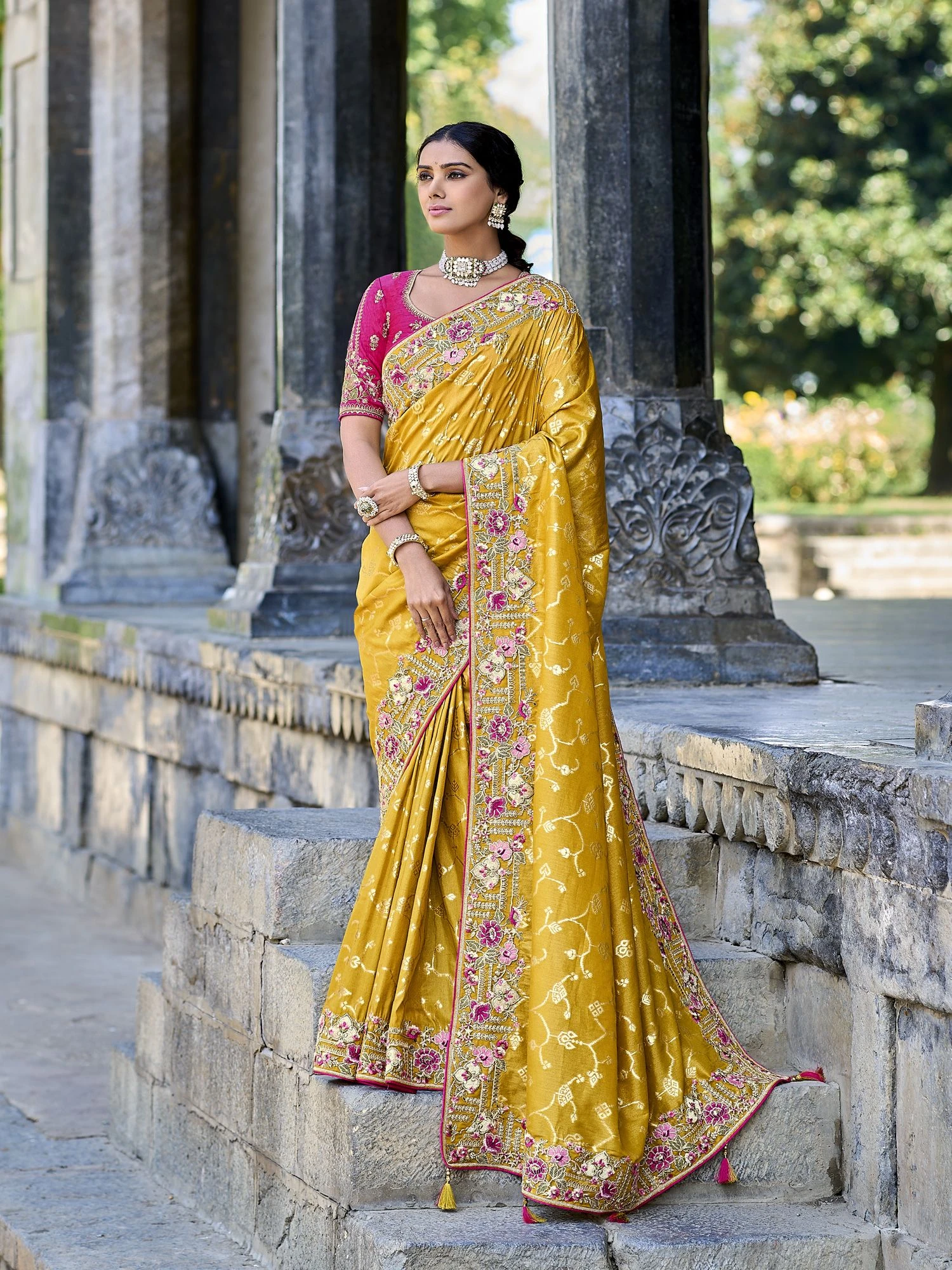Capture the essence of femininity wearing this amber yellow color saree crafted in silk. Enhanced using stones, zari and thread work embroidery, showcasing distinstive borders and pallu. Comes with a matching pink color embroidered blouse in silk. Note: The accessories featured are purely for fashion purposes. Due to photography reasons, some color variations may occur. The un-stitched blouse may be customized up to 42 inches.