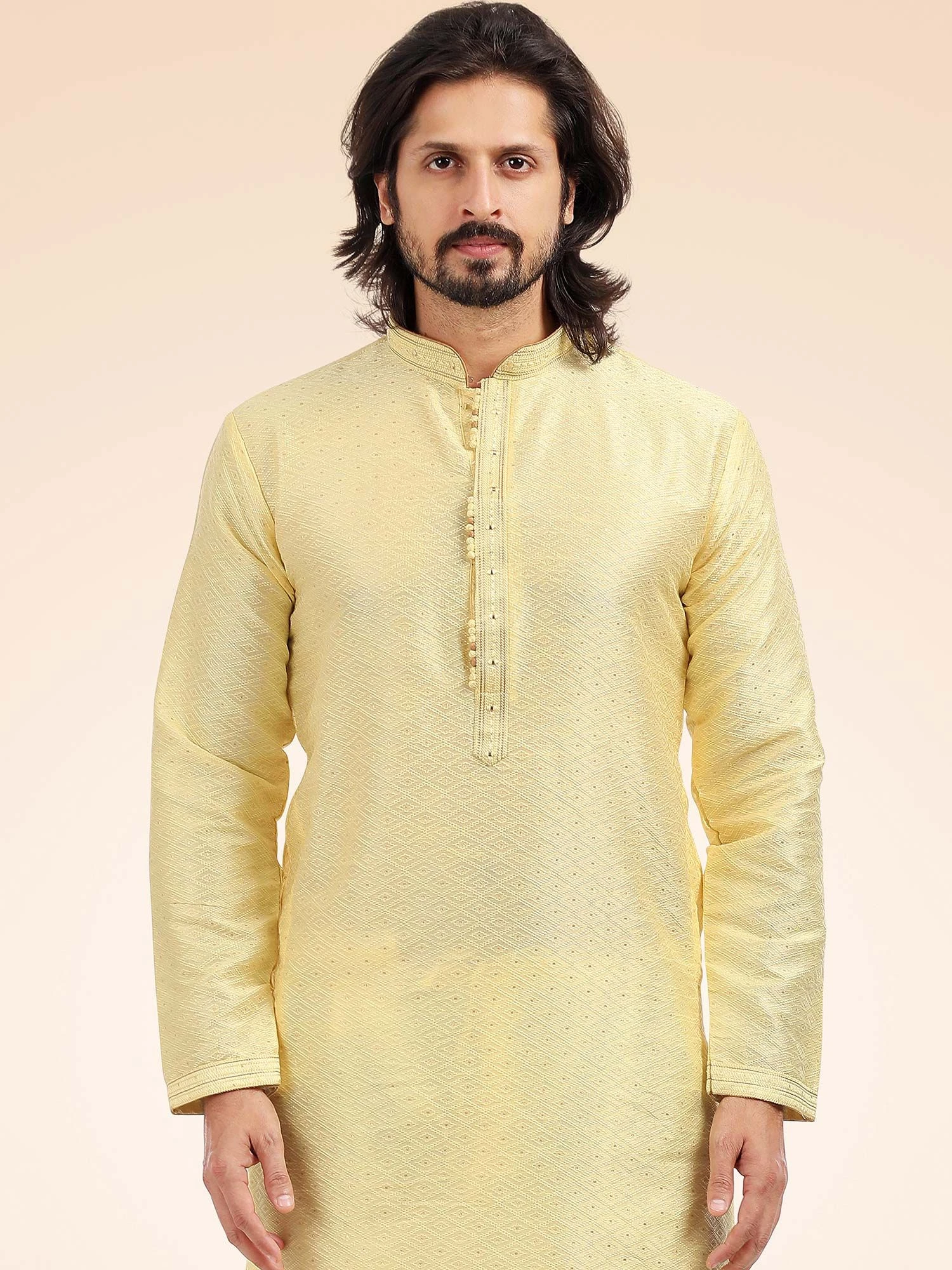Presenting this baby yellow color men’s kurta made in banarasi silk. Crafted using thread embroidered details all over. Available with matching white color churidar pants in art silk. Note: Some color variations may occur owing to photography causes. Up to 1 inch of measurement fluctuation is possible.