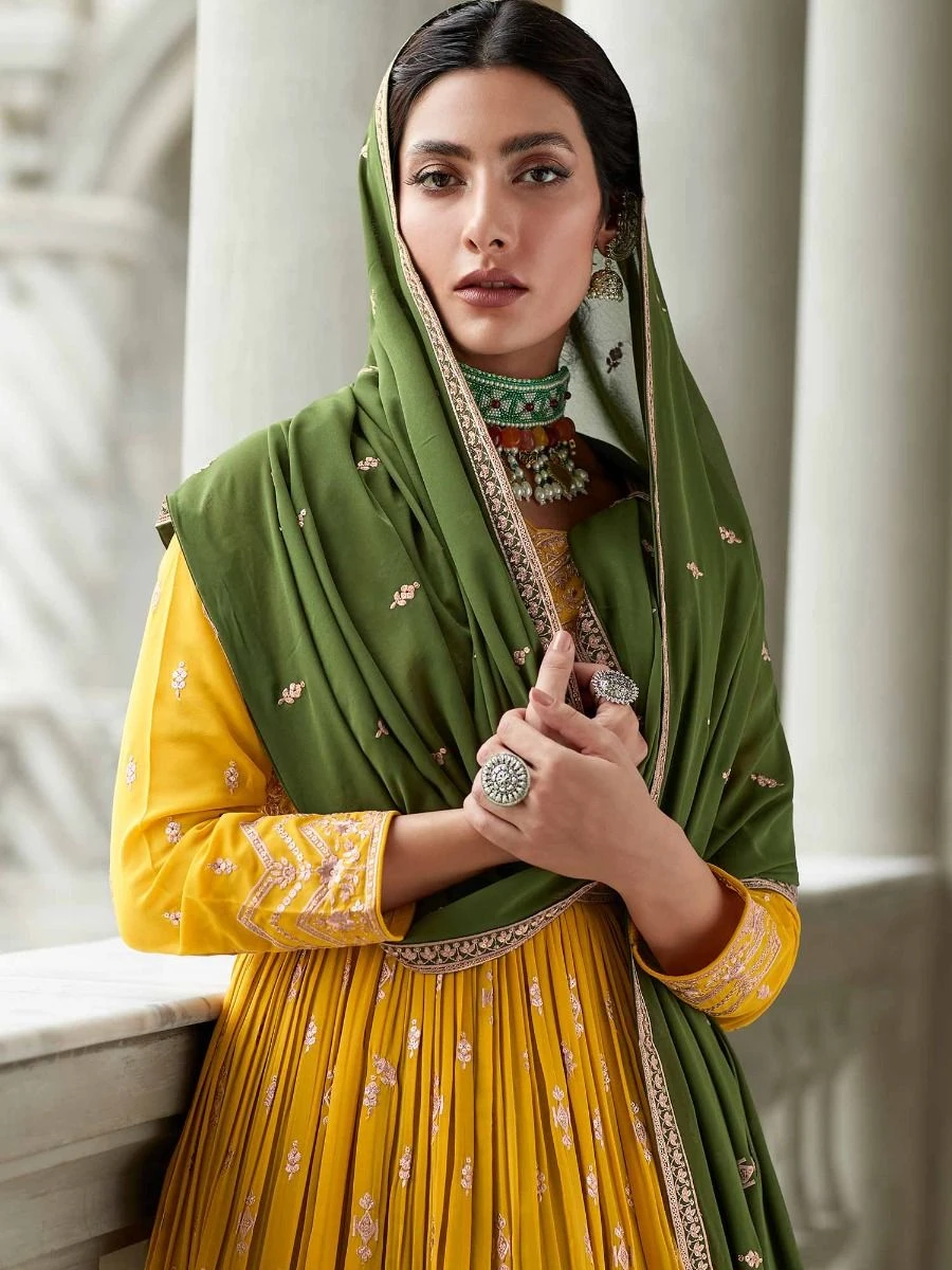 Shine brighter than the sun wearing this bright yellow hued kurti in georgette. Decorated with sequins and thread embroidered work. Teamed with contrast matching green color georgette lehenga and dupatta, both embellished in similar work. Note: The accessories featured are purely for fashion purposes. Due to photography reasons, some color variations may occur. The semi-stitched choli and lehenga waist may be customized up to 42 inches.