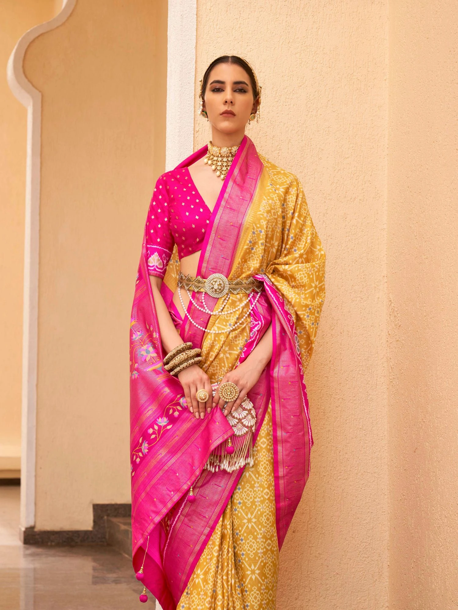 Grace the occasion with your presence this amber yellow color saree crafted in silk. Designed using printed patterns, showcasing distinstive borders and pallu. Comes with a matching pink color blouse in silk. Note: The accessories featured are purely for fashion purposes. Due to photography reasons, some color variations may occur. The un-stitched blouse may be customized up to 42 inches.