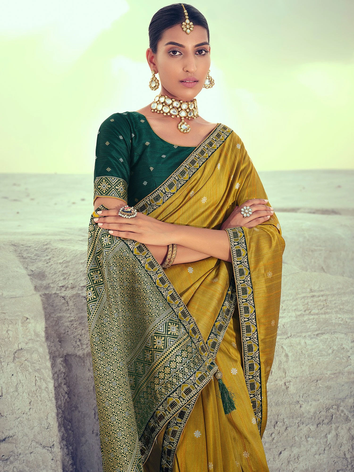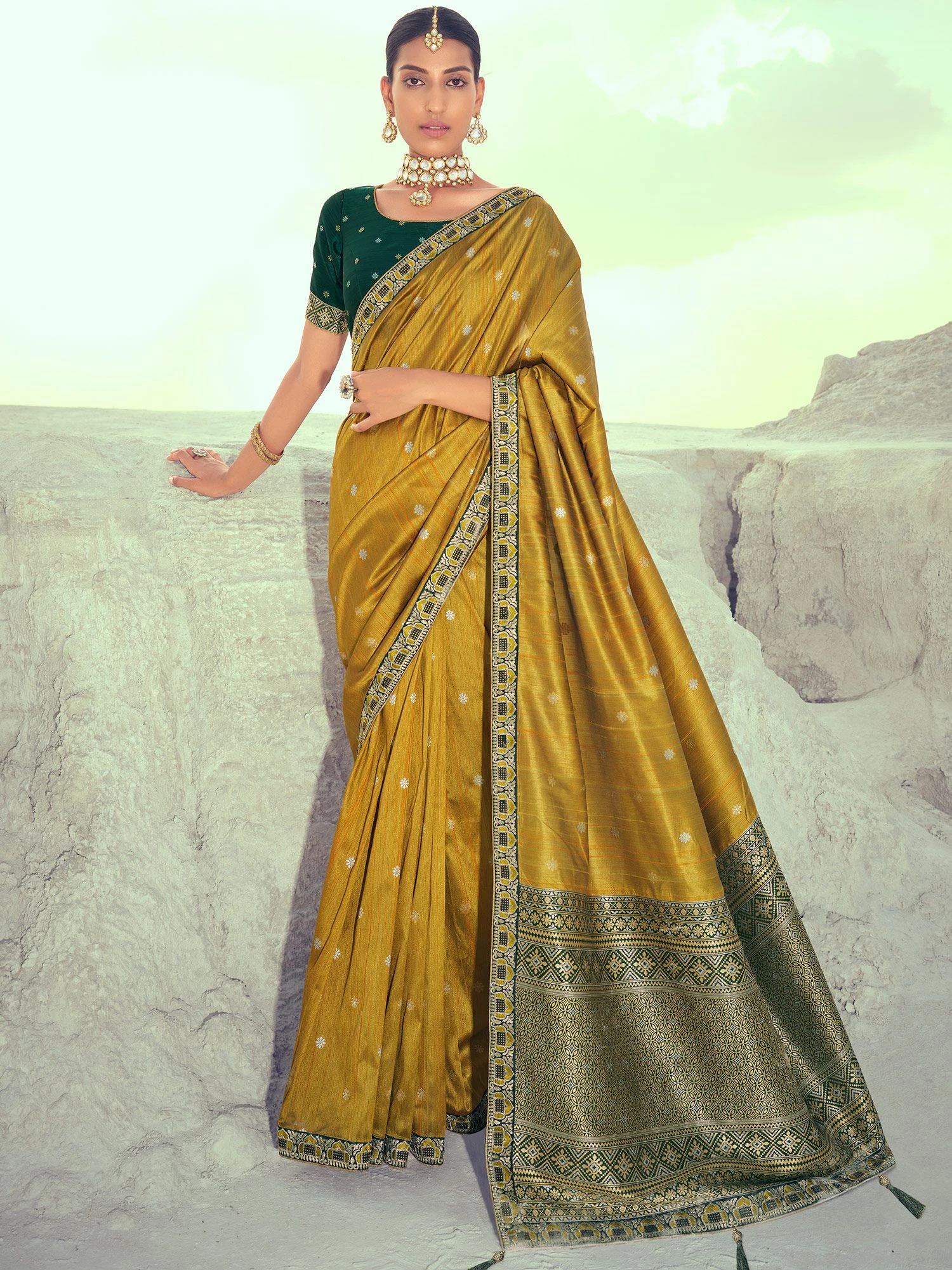 Invigorate your wardrobe by adding this goldenrod yellow color saree designed in art silk. Crafted using woven patterns, exposing isolated borders and pallu. Paired with a matching dark green color blouse in art silk. Note: The accessories featured are purely for fashion purposes. Due to photography reasons, some color variations may occur. The un-stitched blouse may be customized up to 42 inches.