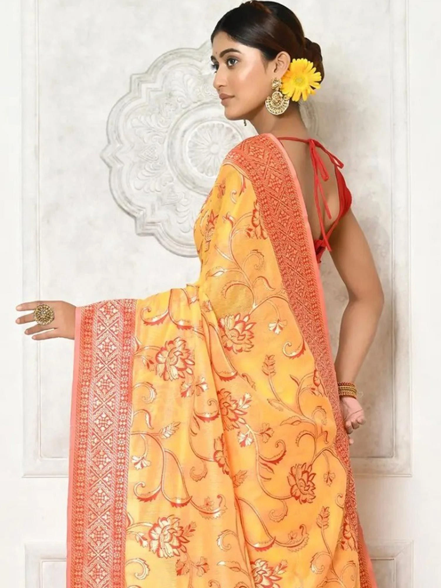 Illuminte your surroundings wearing this bright yellow color saree crafted in cotton. Furnished using zari woven floral patterns, showcasing distinstive borders and pallu. Available with a matching red color blouse in cotton. Note: The accessories featured are purely for fashion purposes. Due to photography reasons, some color variations may occur. The un-stitched blouse may be customized up to 42 inches.